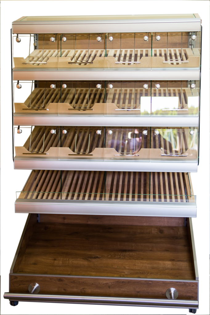 an jeder Etage 4 Klappen aus Sicherheitsglas, montiert auf Edelstahlscharnieren Unterbaukorpus beleuchtet